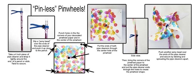 Rather than use pencils for the "stick" of the pinwheel, we have used plastic straws (local restaurants will likely donate them - or, you can purchase them at a "warehouse-type" store) and bamboo skewers.